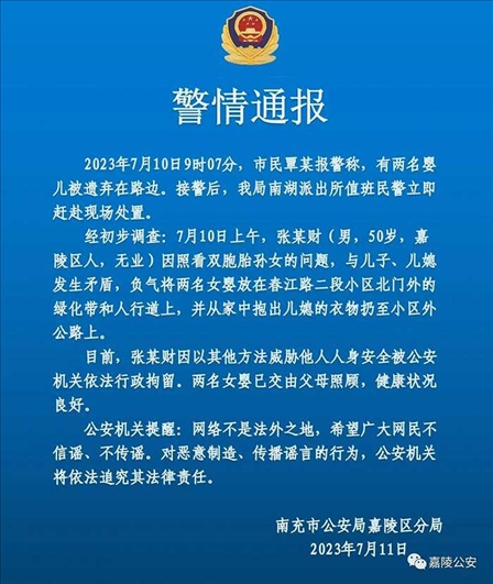 ·网传“老人当街遗弃双胞胎女婴”,警方:系负气而为,已行拘。