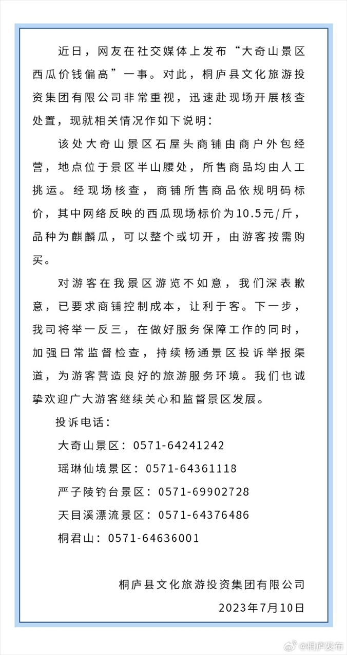 ·一游客反映大奇山景区一个西瓜卖200多元。10日,桐庐文旅集团致歉称,商品均由人工挑运,对游客在景区游览不如意深表歉意,已要求商铺控制成本,让利于客。