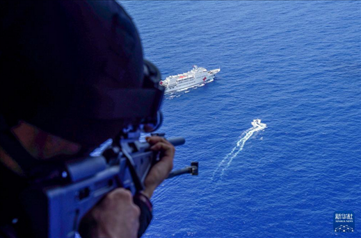 7月10日,中国海军“和平方舟”号医院船在太平洋上组织反恐反海盗演练。这是空中打击组进行火力支援。