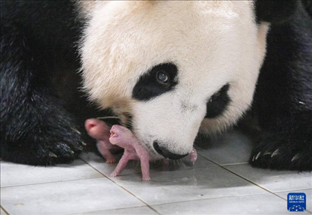 据韩国京畿道龙仁市爱宝乐园介绍,旅韩大熊猫“爱宝(华妮)”于7月7日清晨顺利产下一对雌性双胞胎幼崽。这是旅韩大熊猫“爱宝(华妮)”和“乐宝(园欣)”继2020年诞下“福宝”后在韩国再次自然交配并诞下幼崽。