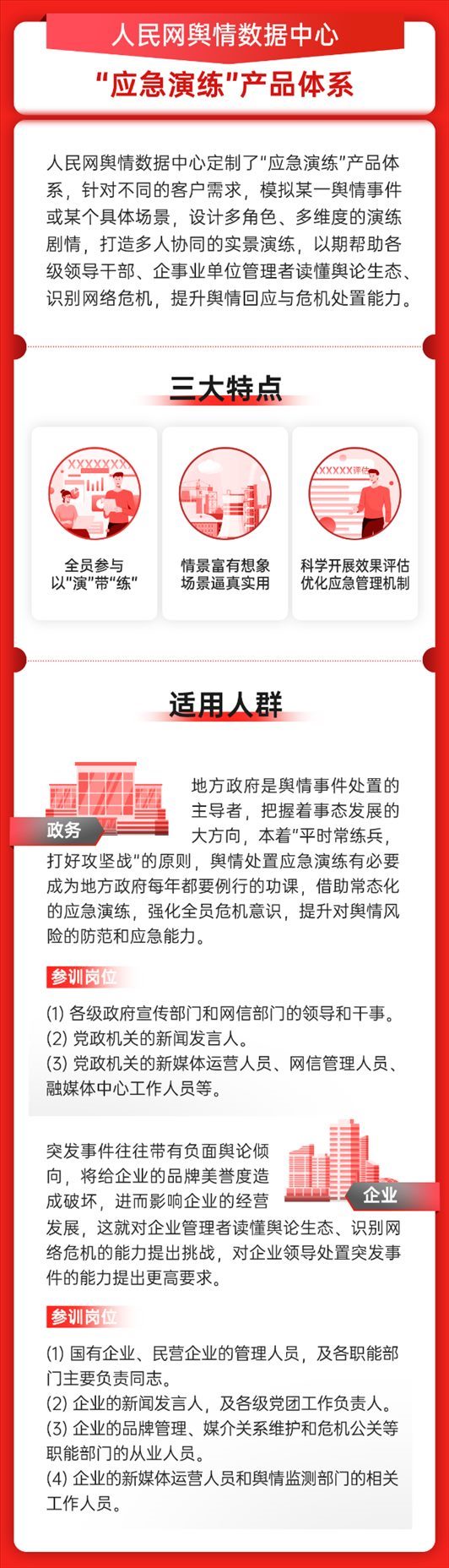 近日,人民网舆情数据中心全面升级“突发事件舆情处置应急演练体系”,旨在帮助各级领导干部、企事业单位管理者进一步读懂新形势下舆论生态、科学研判网络事件,提升舆情回应与应急处置能力。