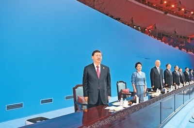 19时58分,在《和平——命运共同体》的乐曲声中,习近平和夫人彭丽媛,同国际大学生体育联合会代理主席艾德等步入主席台,向观众挥手致意。全场响起长时间的热烈掌声。