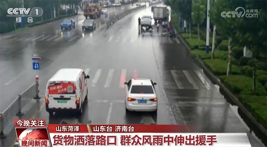 近日,山东菏泽定陶区出现持续强降雨过程,因雨天路滑,一辆载满货物的车辆转弯时,车上装载的一吨多矿泉水洒落一地,风大雨急,货车司机束手无策。这时,又一辆货车停在了车前,从车上下来三位女士帮助货车司机搬运货物,过往群众也纷纷冒雨参与其中。在大家共同努力下,洒落的货物十分钟就被整理干净。