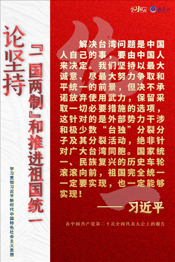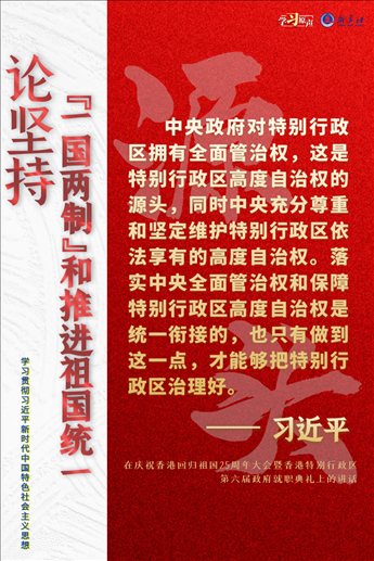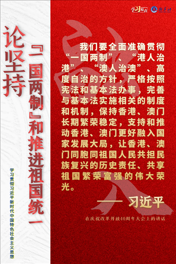 “一国两制”是党领导人民实现祖国和平统一的一项重要制度,是国家的一项基本国策。中国特色社会主义进入了新时代,意味着“一国两制”事业也进入了新时代。不断推进“一国两制”在香港、澳门的成功实践,是中华民族伟大复兴历史进程的重要组成部分。