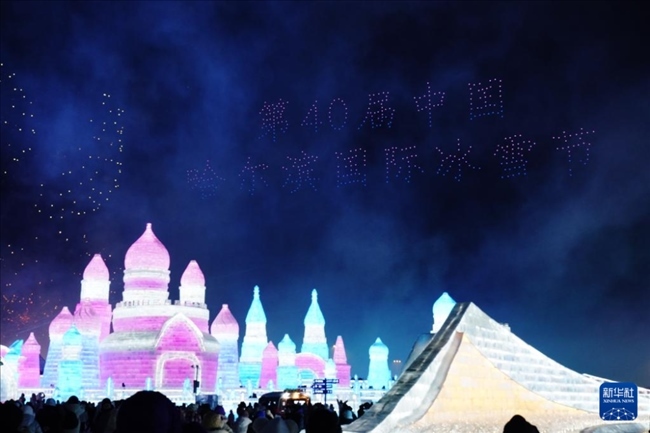 1月5日,在哈尔滨冰雪大世界园区,游客在观看哈尔滨国际冰雪节开幕式上的无人机表演。当日,第40届中国·哈尔滨国际冰雪节开幕,吸引众多游客。新华社记者 王建威 摄