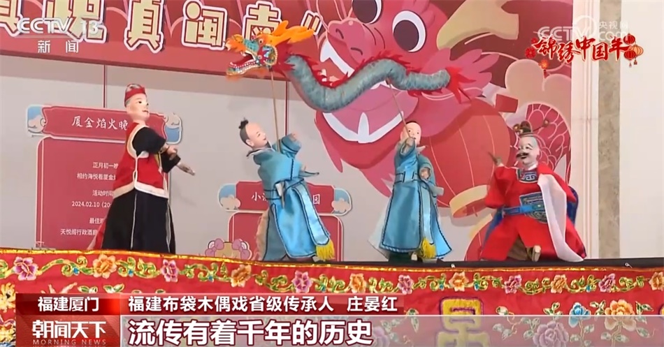 同样在春节期间受到游客喜爱的还有厦门的非遗项目布袋木偶。庄晏红是布袋木偶戏演出团队的一员,她告诉我们,春节期间,团队会有20多场的演出,忙得热火朝天,在景区、酒店、艺术馆为游客展示非遗魅力。