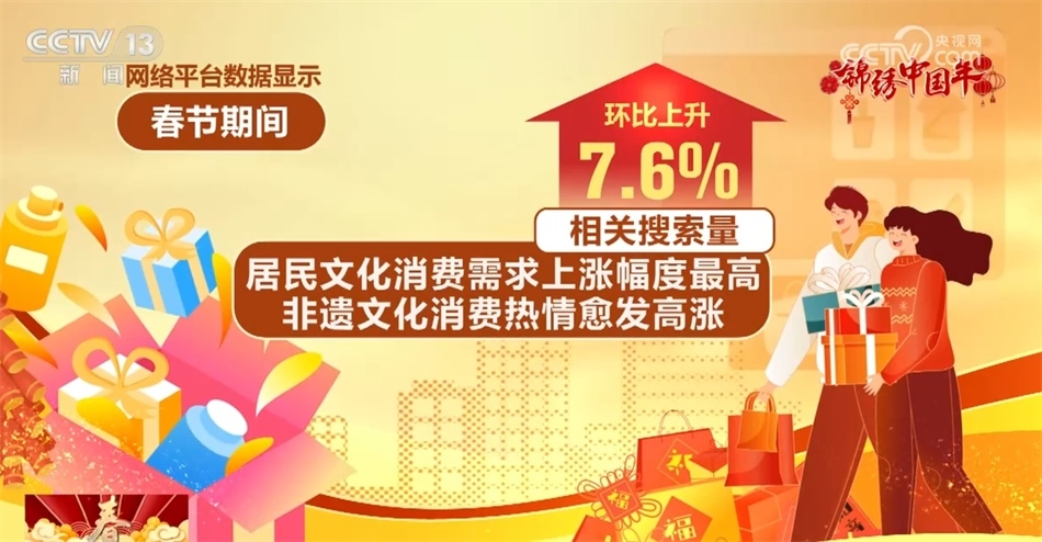 网络平台数据显示,春节期间,居民文化消费需求上涨幅度最高,非遗文化消费热情愈发高涨,相关搜索量环比上升7.6%。其中,非遗庙会、灯会最受游客欢迎。