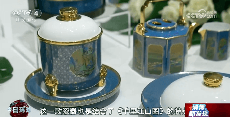 江西省景德镇市商务局工作人员章少聪介绍称:“这一幅画是北宋王希孟先生创作的,叫作《千里江山图》。这一款瓷器也是结合了《千里江山图》的特点,把中国传统画中的山水、花鸟都完全在瓷器上面展现出来。”