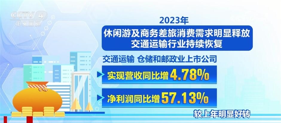 2023年,休闲游及商务差旅消费需求明显释放,交通运输行业持续恢复,交通运输、仓储和邮政业上市公司实现营收、净利润同比增4.78%、57.13%,较上年明显好转。