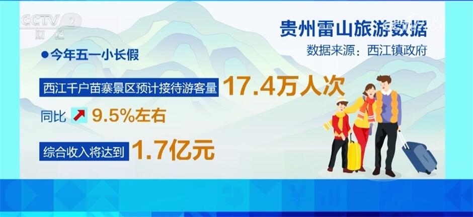今年“五一”小长假,西江千户苗寨景区预计接待游客量达17.4万人次,同比增长9.5%左右,综合收入将达到1.7亿元。依托旅拍行业,一条集美妆、跟拍、服装租赁、首饰定制等于一体的产业链正在加速生成,文旅发展还带动了西江千户苗寨及雷山县周边村寨两万多人就业。