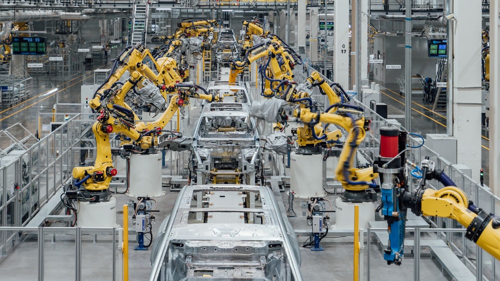 这是在重庆市两江新区拍摄的赛力斯汽车超级工厂焊装车间生产线(2024年2月26日摄,无人机照片) 新华社发(高彰 摄)。