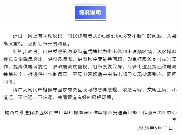 ·广东揭阳一村电费从3毛涨到6毛8?官方回应:开展电网改造并实现抄表到户、同网同价。