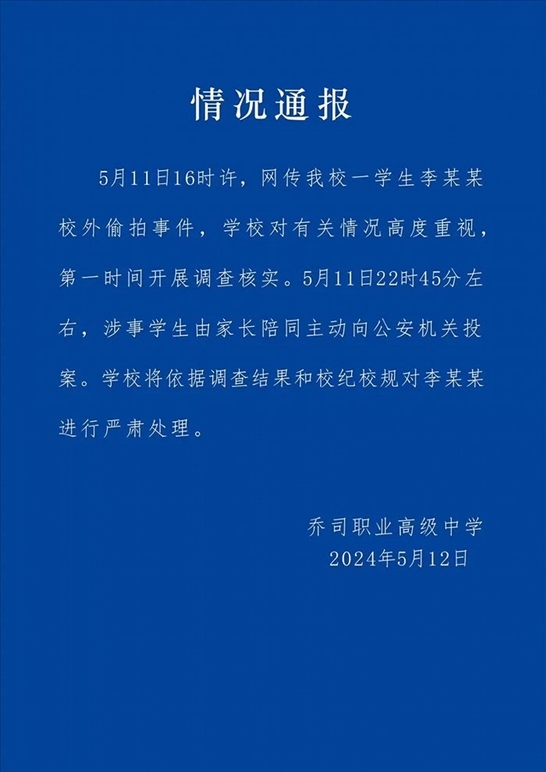 ·杭州市一职高通报学生校外偷拍女生裙底事件:涉事学生由家长陪同主动投案。