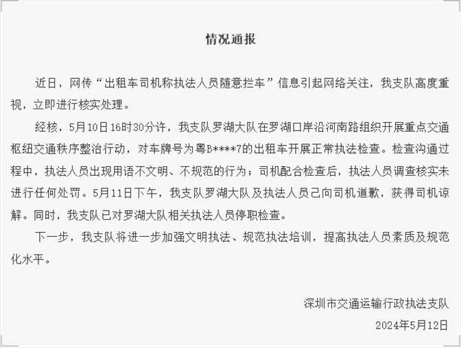 ·深圳出租车司机称执法人员随意拦车?官方发布情况通报。