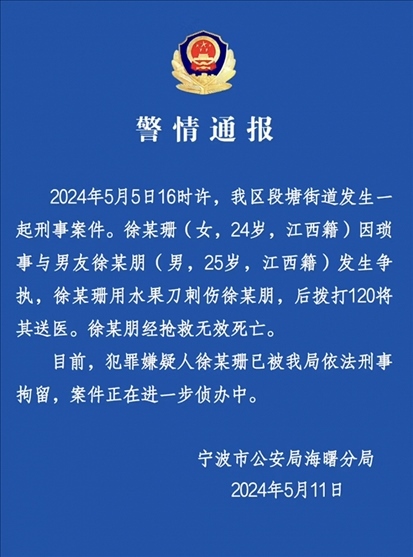 ·宁波警方通报女子因琐事刺死男友:犯罪嫌疑人已被刑拘。