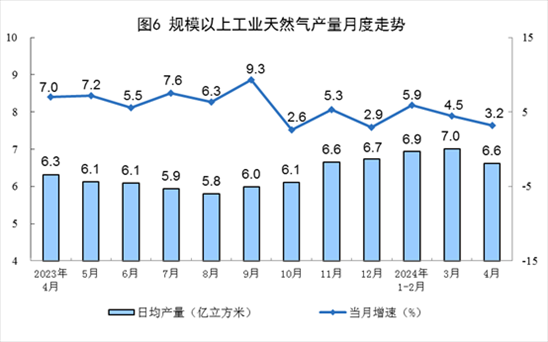 天然气生产稳定增长,进口保持较快增长。4月份,规上工业天然气产量198亿立方米,同比增长3.2%,增速比3月份放缓1.3个百分点;日均产量6.6亿立方米。进口天然气1030万吨,同比增长15.1%。