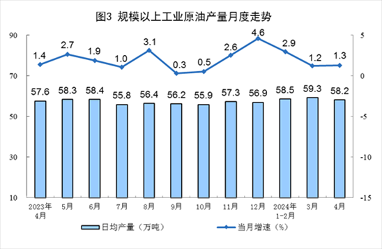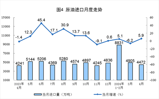 1—4月份,规上工业原油产量7095万吨,同比增长2.1%。进口原油18207万吨,同比增长2.0%。