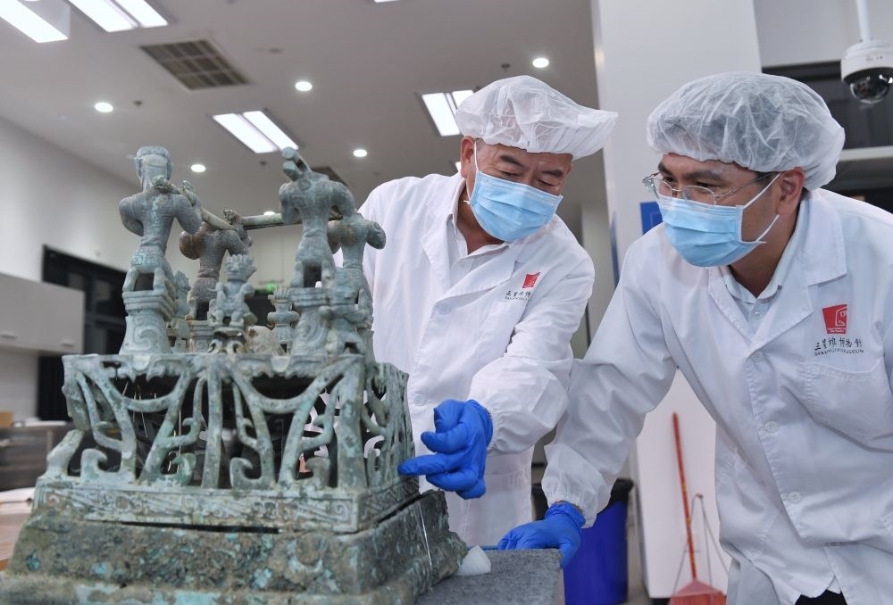 2023年5月30日,在四川三星堆博物馆文物保护和修复中心,三星堆博物馆陈列保管部副部长郭汉中(左)与同事讨论神坛底座修复方案。