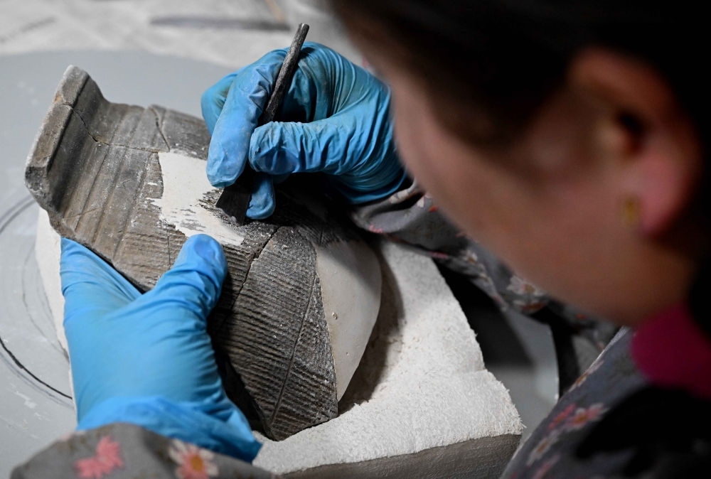 2024年2月23日,在中国社会科学院考古研究所安阳工作站,工作人员在整理修复殷墟洹北商城出土的陶片。