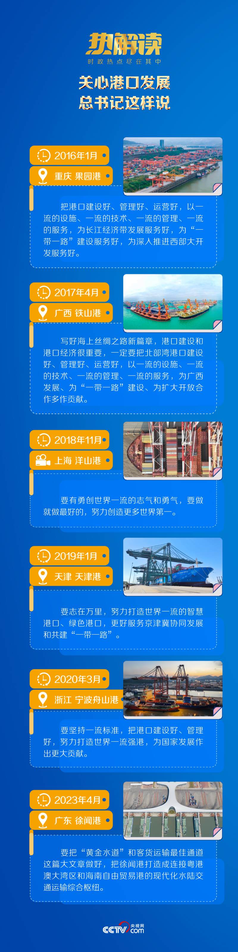 从内河航运的黄金水道到国际航运的港通四海,总书记多次在考察行程中关注我国沿海沿江港口建设,精心谋划推进世界一流强港建设工作。