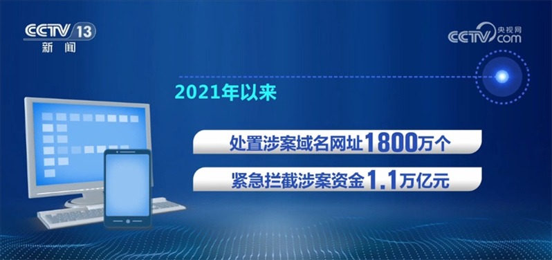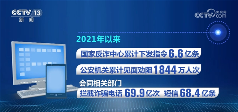 公安机关持续推进预警劝阻和技术反制工作。2021年以来,国家反诈中心累计下发指令6.6亿条,公安机关累计见面劝阻1844万人次,会同相关部门拦截诈骗电话69.9亿次、短信68.4亿条,处置涉案域名网址1800万个,紧急拦截涉案资金1.1万亿元。