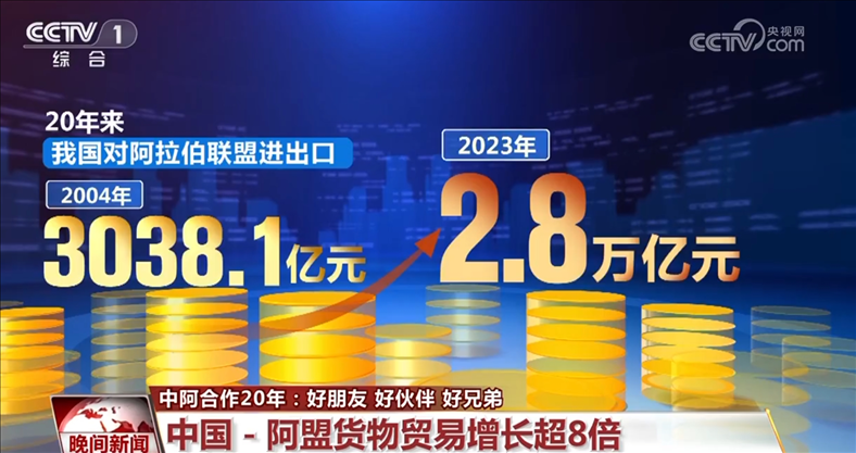 据海关统计,20年来,我国对阿拉伯联盟进出口由2004年的3038.1亿元人民币大幅增长820.9%至2023年的2.8万亿元。今年前4个月,我国对阿盟进出口9461.7亿元,创历史同期新高,同比增长3.8%,占我国对外贸易总值的6.9%。
