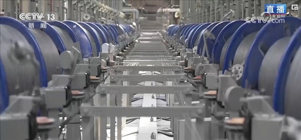 相对普通钢帘线来说,这样的钢丝组成的钢帘线强度更高,可以减少轮胎里面橡胶原料的使用,减轻轮胎整体的重量。这里的工作人员介绍,在钢帘线制造过程中,工艺流程自动化程度低一直是行业“痛点”。现在,企业通过人工智能、数字化,实现了从原材料进厂到成品出库全流程的自动化生产。