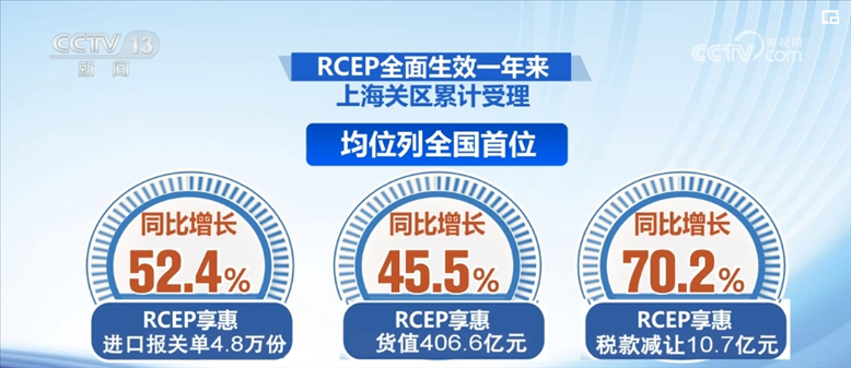 在上海,RCEP全面生效一年来,上海关区累计受理RCEP享惠进口报关单4.8万份,货值406.6亿元,税款减让10.7亿元,均位列全国首位,同比分别增长52.4%、45.5%和70.2%,