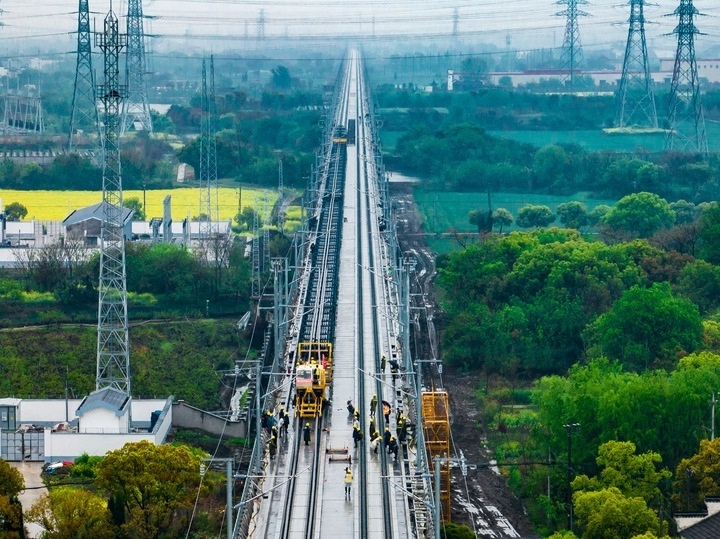 2024年4月7日,沪苏湖铁路铺轨进入湖州吴兴段。拍友 闵峰 摄