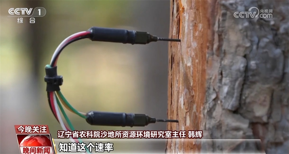 记者在采访时看到,一棵树的树干上插了两根探针,据辽宁省农科院沙地所资源环境研究室主任韩辉介绍,这是用来监测树干水分的。通过监测两根探针之间的温差,他们就能够计算出这棵树的液流速率。知道这个速率,他们就可以了解这棵树的生长状态,这个实验的最终目的,是想得出在单位面积上到底有多少棵樟子松最合理。