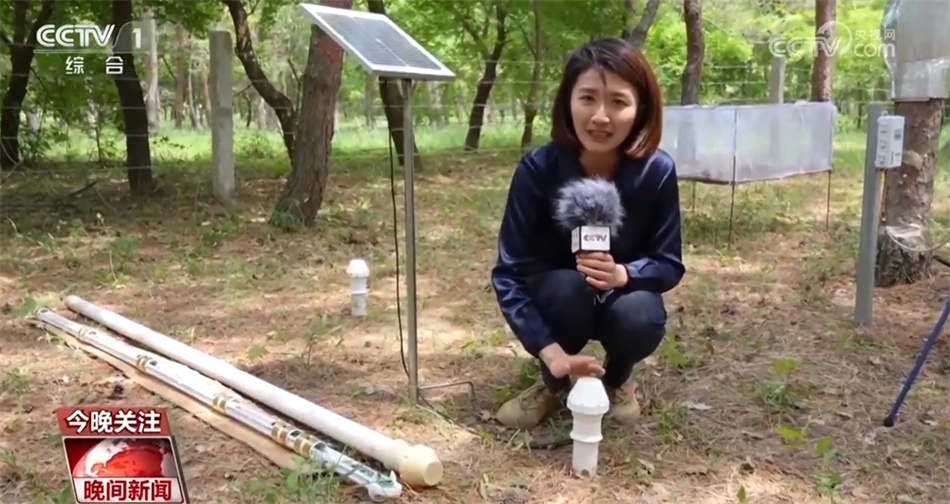 要了解樟子松的生长密码,单靠监测这一项是不够的。在整个林子中,有十几个设备都正在为这片樟子松林做着24小时不间断的体检。像这个2米长的大管子,像一个体温计,里面在不同深度安装了6层传感器。把它直接插到土壤中,就可以监测出地块土壤的湿度、温度、盐分、肥力等。