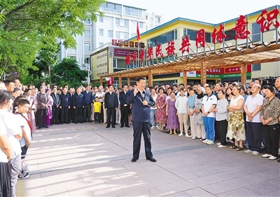 傍晚时分,社区广场十分热闹,居民们看见总书记来了,纷纷围拢过来,热烈鼓掌欢迎。习近平亲切地对大家说,时隔4年,我再次来宁夏看望各族干部群众,见到大家非常高兴!中华民族是一个大家庭,各族人民要像石榴籽一样紧紧抱在一起。要不断铸牢中华民族共同体意识,把各族人民的心紧紧连在一起,把各方面的力量广泛凝聚到一起,共同推进中国式现代化,共襄中华民族伟大复兴的盛举。