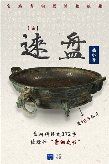 这件青铜器是被称作“青铜史书”的逨盘。盘内铸铭文372字,完整记录了单氏家族八代人辅佐西周12位周王征战、理政、管治林泽的重要史事。从铭文中可看出,周人将家族命运和国家命运紧密结合,也是后来儒家“修身、齐家、治国、平天下”的思想基础。