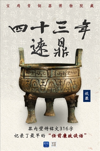 四十三年逨鼎共出土10件,大小不一。这是体积最大的一件,器内壁铸有铭文316字,讲述了周宣王43年,逨被提拔为官司历人,相当于现在的监察官。周天子告诫逨要施政谨慎、依法处罚、明辨是非、廉洁从政。这与《周礼》中的“六廉”——廉善、廉能、廉敬、廉法、廉正、廉辨相互呼应。
