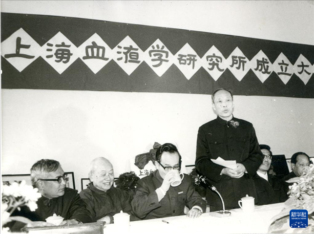 1987年3月23日,王振义(左四)参加上海血液学研究所揭牌仪式。新华社发(上海交通大学医学院供图)