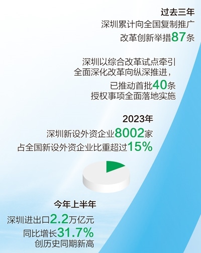 改革开放释放澎湃动能。深圳发布支持外商投资生物医药领域、实施跨境贸易投资高水平开放政策试点等20条措施,出台优化国际化营商环境工作方案,持续提升对全球优质要素资源的强大吸引力。去年全年,深圳新设外资企业8002家,占全国新设外资企业比重超过15%;今年上半年,深圳进出口总额2.2万亿元,同比增长31.7%,创深圳历史同期新高。