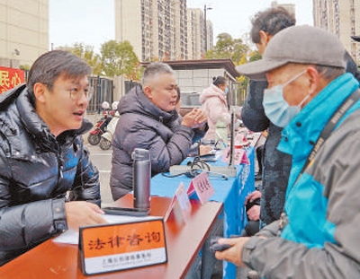 宝山区新顾城大居拓展区联合党支部开展便民服务活动。图为工作人员为居民提供法律咨询。