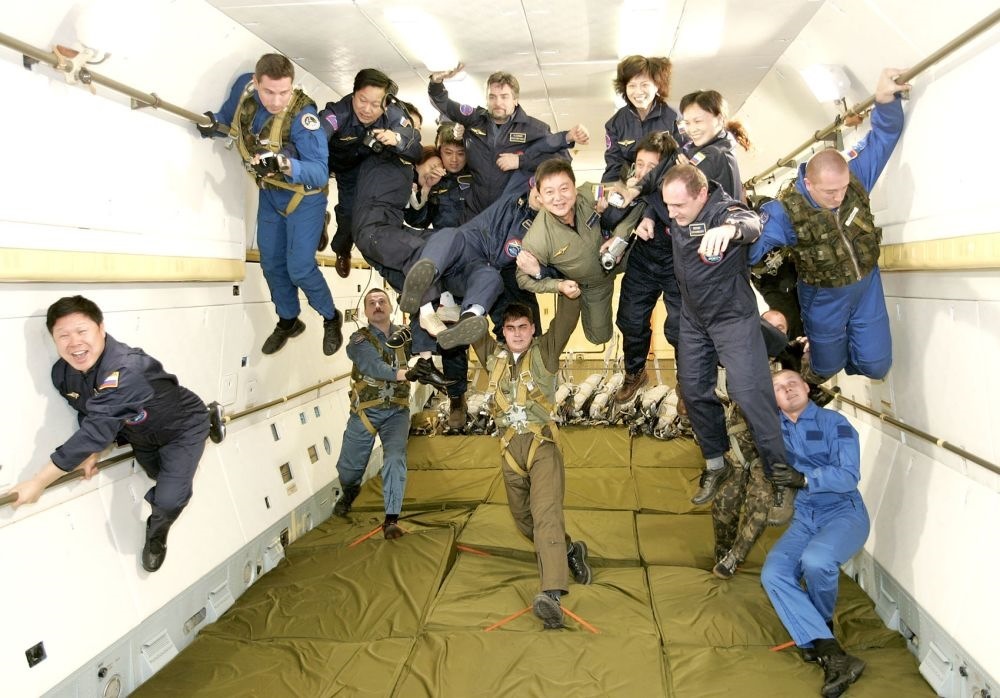 2004年12月17日,在俄罗斯首都莫斯科的加加林阿特拉斯宇航中心,10名中国游客在俄罗斯宇航员的保护下体验太空失重训练。