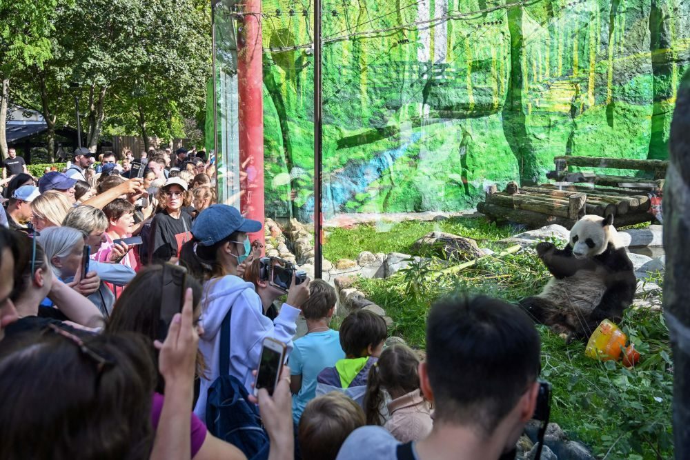 2024年7月31日,观众在俄罗斯莫斯科动物园拍摄大熊猫“如意”。当日,莫斯科动物园为来自中国的大熊猫“如意”庆祝生日。雄性大熊猫“如意”2016年7月31日出生于中国四川雅安碧峰峡基地,它和大熊猫“丁丁”于2019年4月29日抵达莫斯科,开启为期15年的旅居生活。