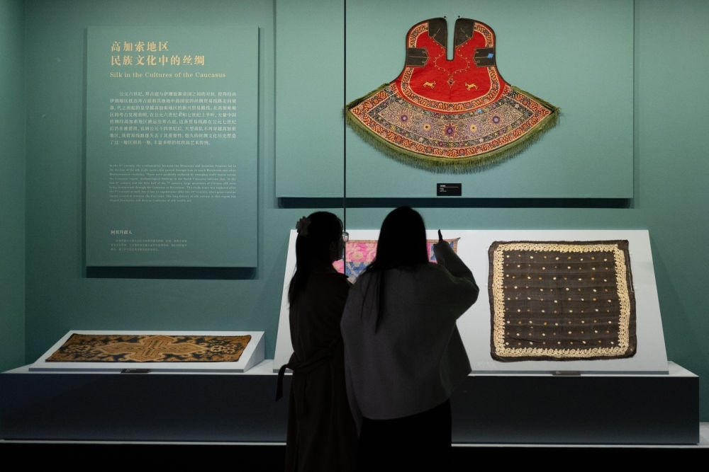 2024年11月22日,由湖北省博物馆、俄罗斯民族博物馆主办的“传统之茧:欧亚大陆民族文化中的丝绸——俄罗斯民族博物馆藏文物展”在湖北省博物馆开幕。这是参观者在欣赏展品。
