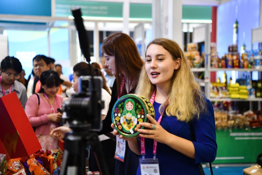 2023年9月19日,来自俄罗斯的参展商在陕西杨凌农高会展台进行直播。