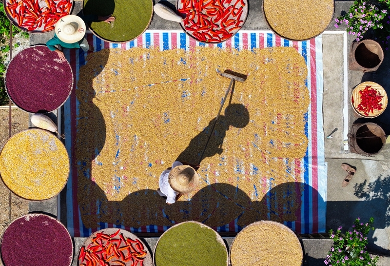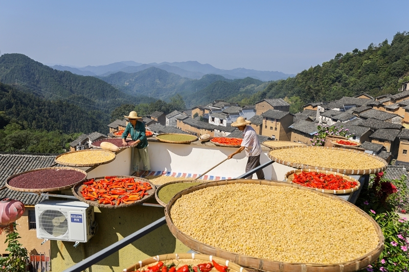秋收时节,在安徽省黄山市歙县深渡镇阳产村,村民利用晴好天气,抓紧晾晒收获的辣椒、玉米、山核桃等农作物,描绘出一幅山村“晒秋”图。