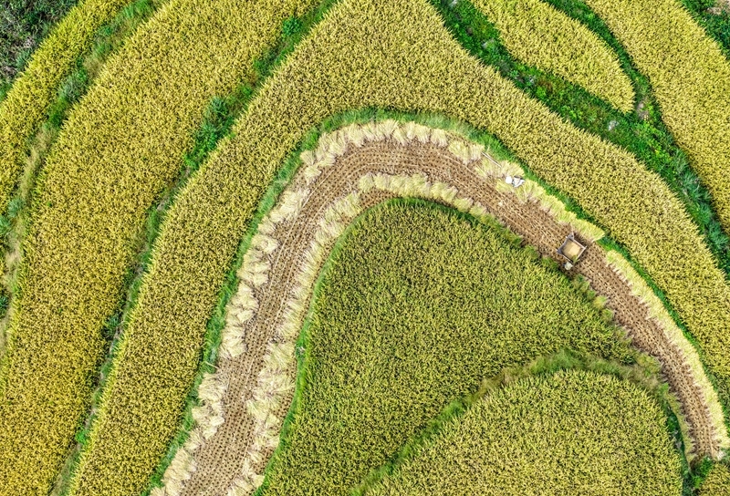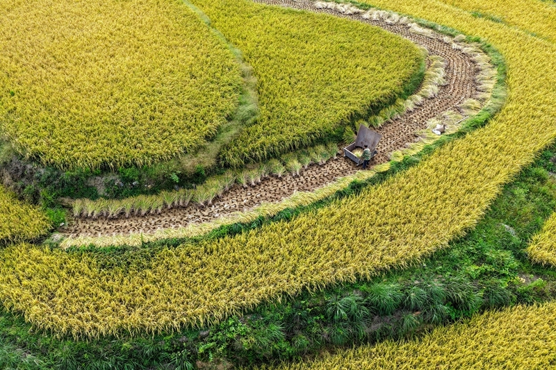 地处武陵山区腹地的重庆市黔江区五里镇水稻种植面积5300亩,是武陵山地区粮食主要产区之一。秋收时节,金黄色的水稻铺满山坡,稻农们利用晴好天气抢收稻谷,呈现出一派美丽的丰收画卷。