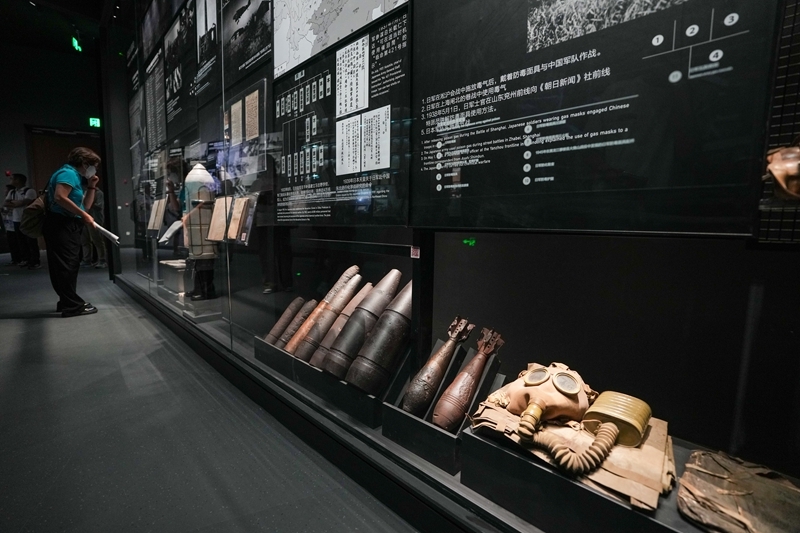 7月8日,在中国人民抗日战争纪念馆《为了民族解放与世界和平》主题展览上,参观者在展示日本侵略者实施细菌战和化学战暴行的区域参观。