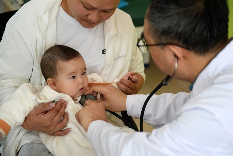在贵阳市观山湖区妇幼保健院,参加“天使之旅——先心病患儿筛查救助行动”的山东第一医科大学附属中心医院医疗专家在为孩子做检查(2025年4月22日摄)。新华社记者 刘勇贞 摄