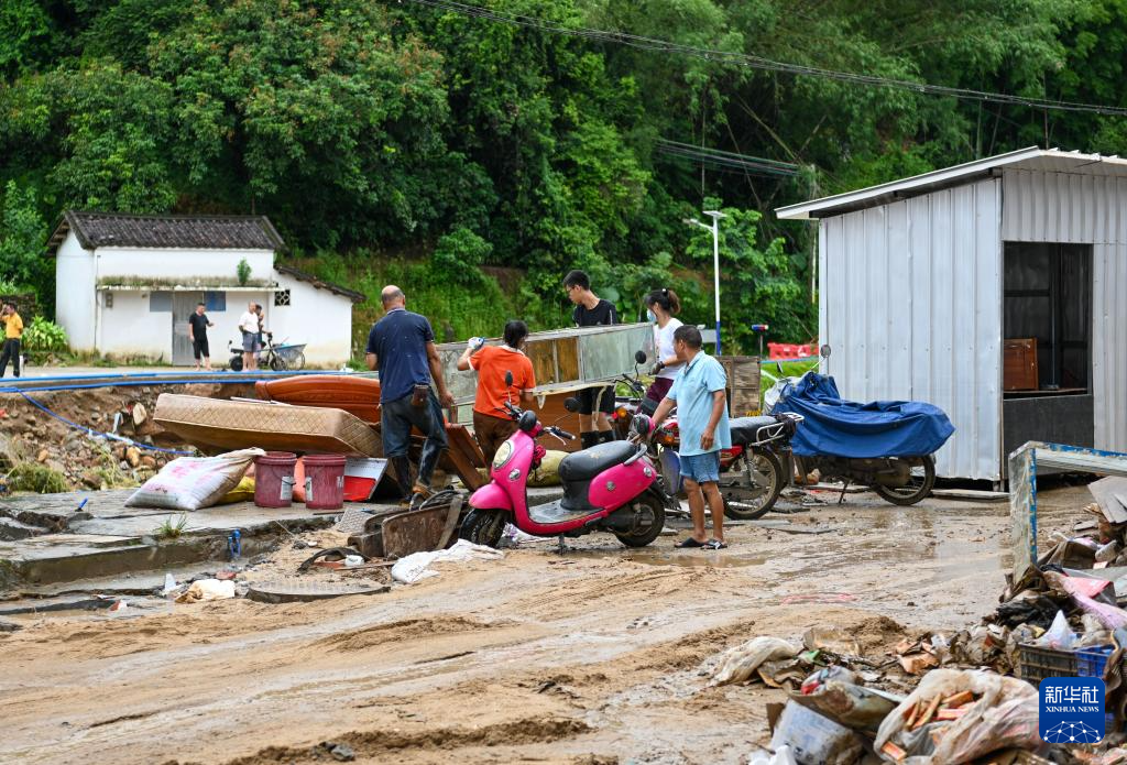 8月6日,村民在广东清远佛冈县石角镇黄花村搬运受损家具。