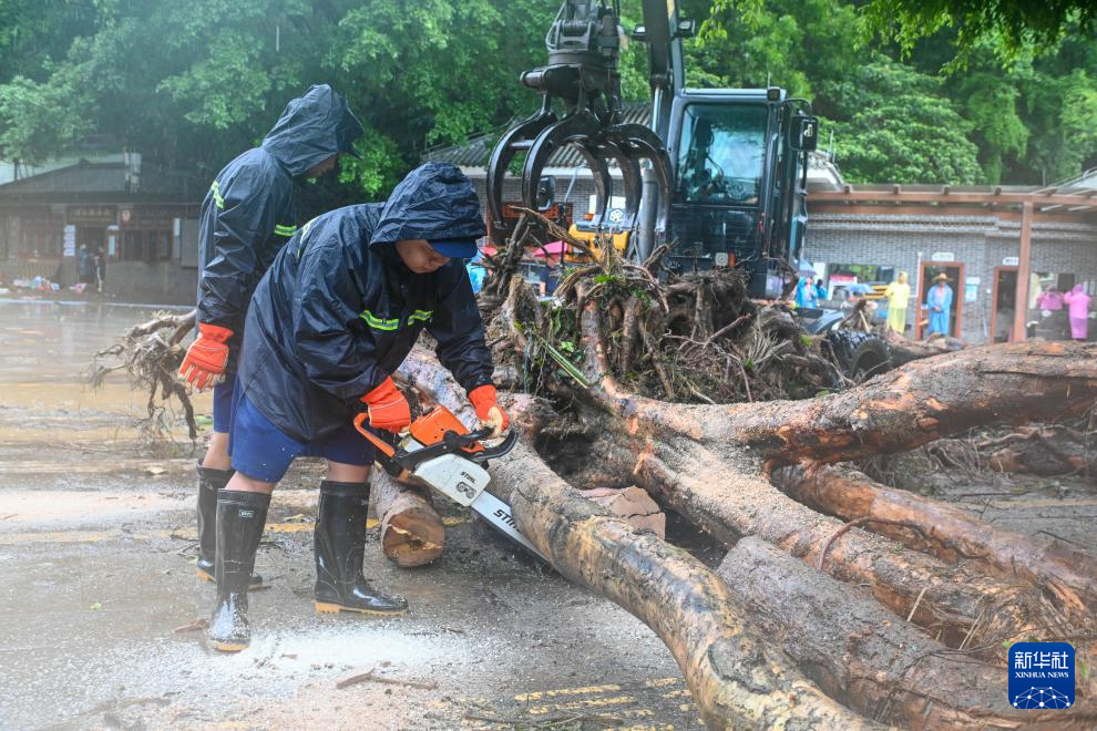 8月6日,工作人员在广东肇庆鼎湖区鼎湖山风景区门口用电锯切割被冲倒的树木。