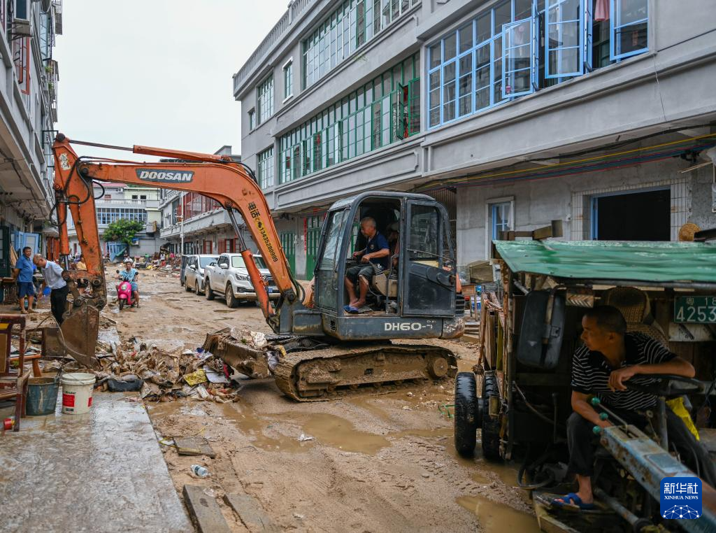 8月6日,在广东清远佛冈县石角镇黄花村,工作人员用挖掘机将村民清理出的淤泥与杂物转移到拖拉机上统一清运。