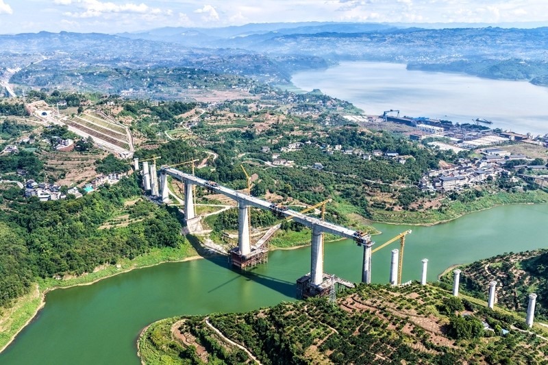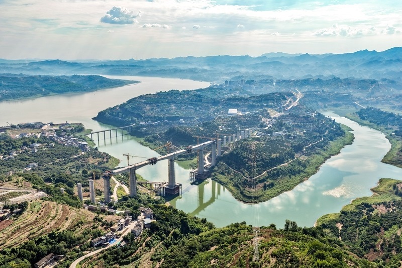 当日,由中国铁建大桥局承建的重庆至万州高速铁路(渝万高铁)渠溪河双线特大桥顺利合龙。渝万高铁渠溪河双线特大桥位于重庆市涪陵区珍溪镇,横跨长江支流渠溪河,全长约953米,是全线重难点工程。