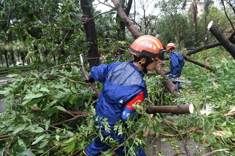 8月25日,在海南省三亚市凤凰路,三亚市消防救援支队救援人员进行清障作业。
